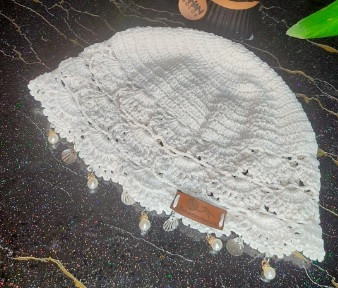 کلاه بادبزنی سفید با آویز مروارید و پولک صدفی نقره ی
