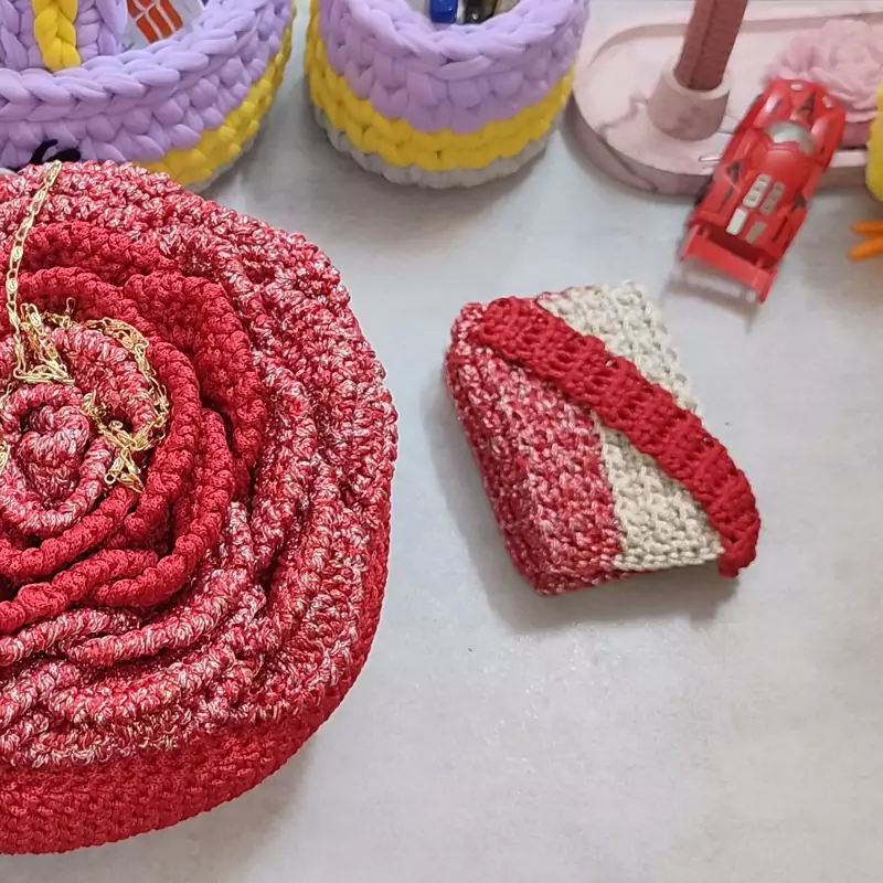 من یک هفته برای بافت این کیف زمان گذاشتم و از بهترین نوع نخ که ایستایی بالایی داره و نخ اسپرت دو رنگ به سبک خودم یافتم تا خاص تر باشه